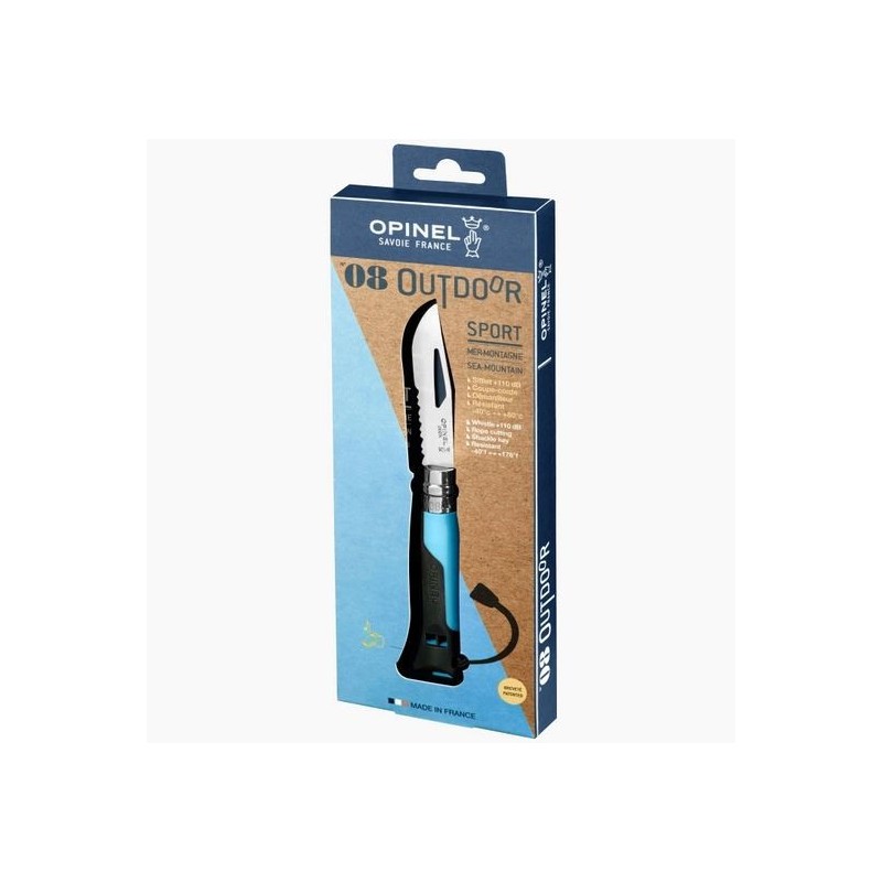 Sa lame très résistante de 2,5 mm d'épaisseur est dotée d'une zone crantée de 3,5 cm, très performante pour couper sans arrachement les cordes naturelles ou synthétiques, ainsi que d'un démanilleur pour les manilles de 4 à 10 mm. Le manche résiste à l'eau et aux températures extrêmes et est équipé d'un sifflet utilisable quel que soit le temps.